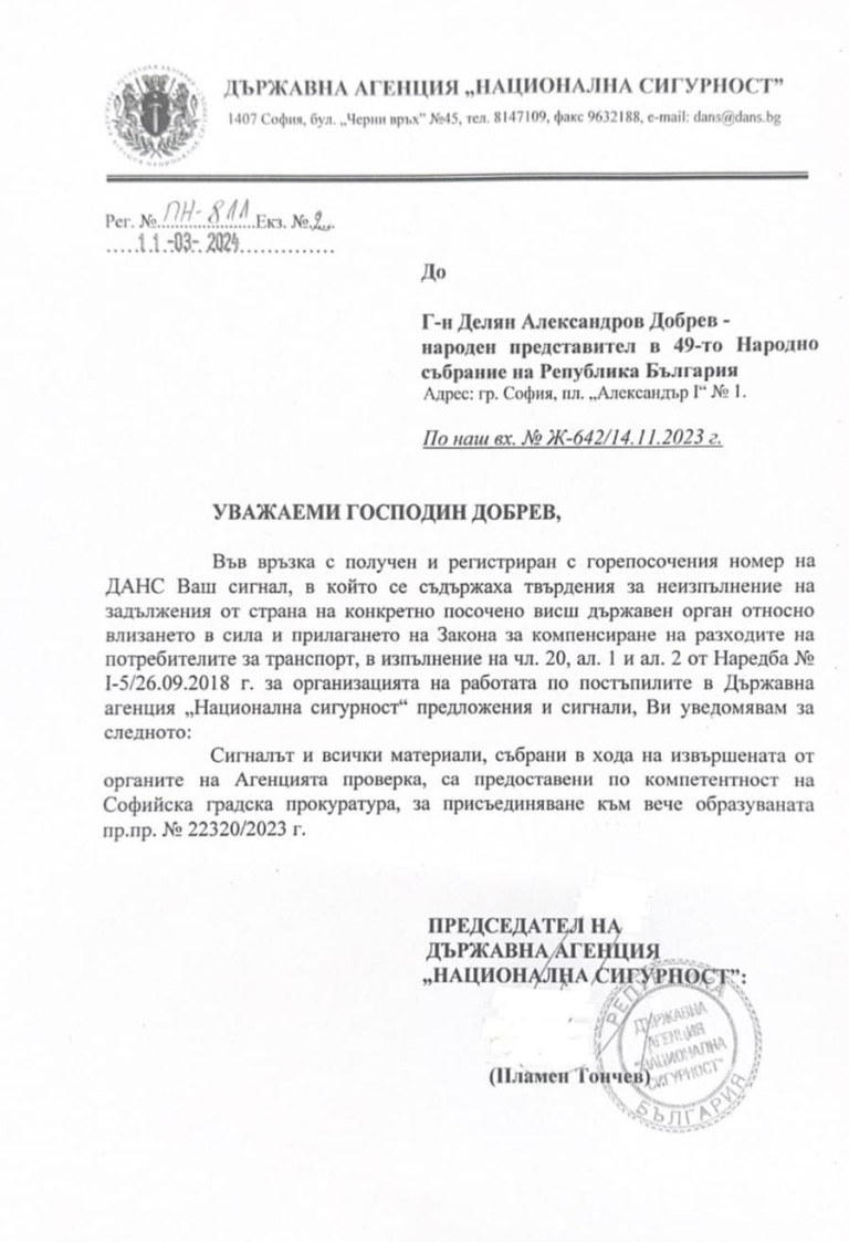 Държавна агенция "Национална сигурност" (ДАНС) е предала на прокуратурата сигнала на депутата от ГЕРБ и председател на енергийната комисия в парламента Делян Добрев срещу премиера Николай Денков и отговорните членове на неговия кабинет за компенсациите за цените на горивата. Това става ясно от публикация на народния представител във "Фейсбук".