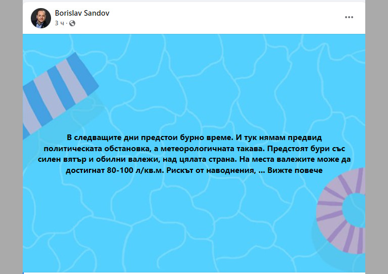 "В следващите дни предстои бурно време. И тук нямам предвид политическата обстановка, а метеорологичната такава. Предстоят бури със силен вятър и обилни валежи, над цялата страна. На места валежите може да достигнат 80-100 л/кв. м", посочва той.