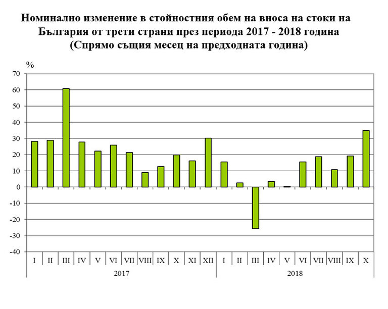 Страната ни обаче отбелязва с 34.9% по-голям внос от трети страни през октомври 2018 г. спрямо същия месец на предходната 2017 година, който е в размер на 2 554.7 млн. лeвa.