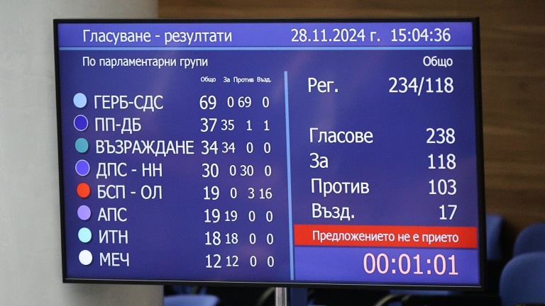 ГЕРБ-СДС гласува против с 69 депутати, ДПС-Ново начало гласува "против", БСП-Обединена левица се въздържаха.