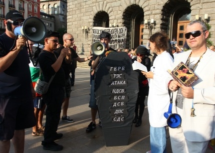 Възрастен мъж пък е донесъл картонен ковчег, в който е решил да погребва партиите, а друг е поставил на врата си плакат, който гласи: „15-ти ден съм тук. Вън червен боклук!". Не е подминато и днешното поведение на Волен Сидеров, като друг протестиращ носи плакат с надпис: „Всеки луд с пистолета си!".