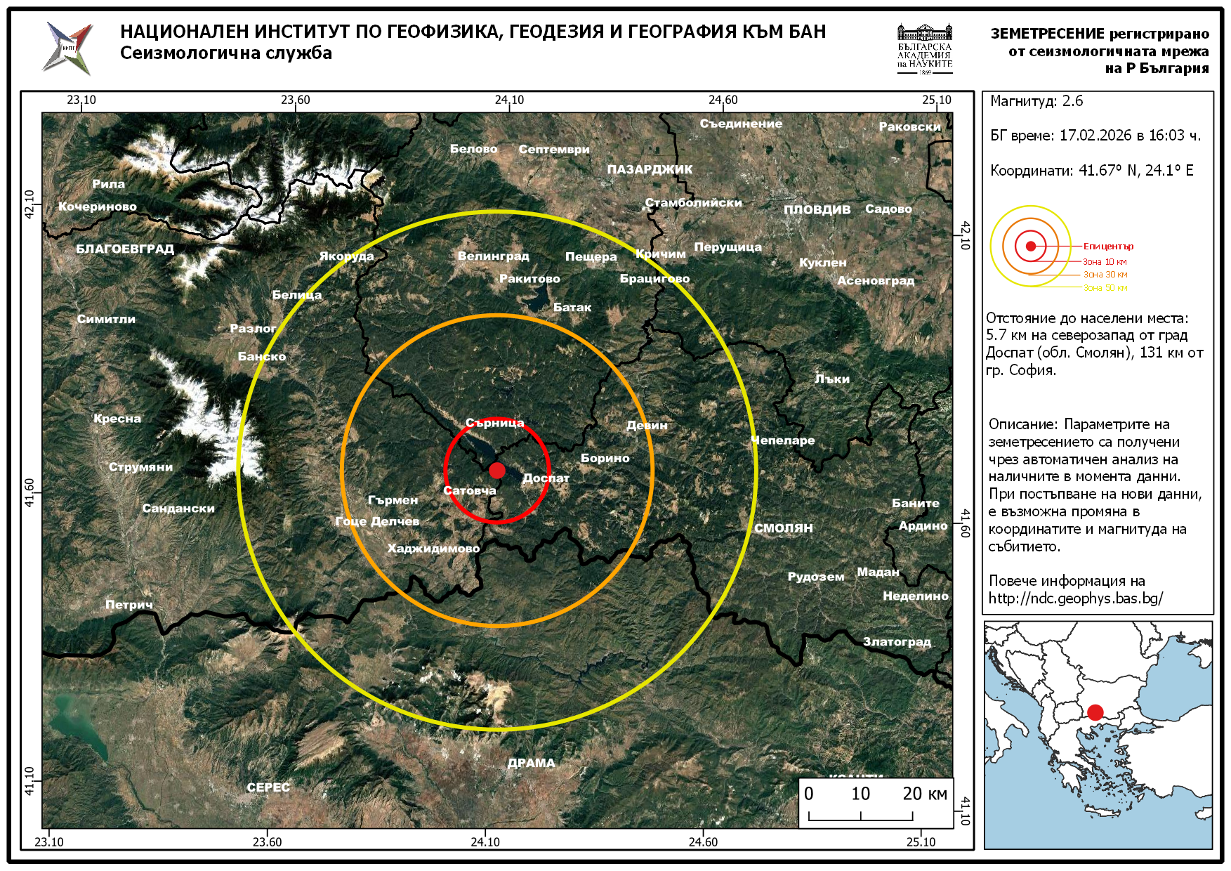 Земетресение от 2.6 по Рихтер е регистрирано край Доспат.