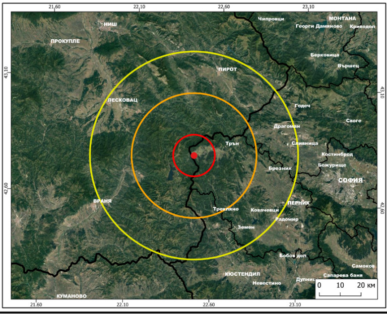 Епицентърът му е на 15.7 км от българския пограничен град Трън в област Перник и на 70 км от София.